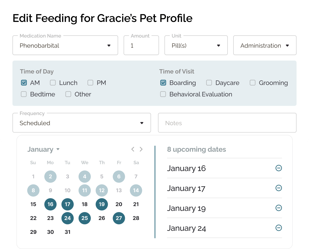 Daily tasks are organized by time of day and space, so your team always knows what’s next and can quickly access vet or emergency info when needed.